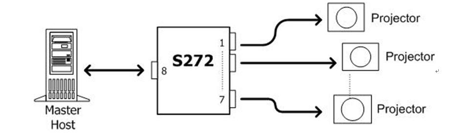 当我们把PC与S272的主串口连接上之后,每一个从串口就可以与投影机连接.于是由PC发出的控制命令就可以同时传给每一台投影机进行功能测试,于是一台计算机就可以同时测试七台投影机。如果我们要测试更多台投影机则可以再多加S272来进行级联动作,把前一级S272的一个从口与下一级S272的主口连接则我们可以增加六个RS232接口(虽然S272可以有七个从口,但是我们必须用一个上一级S272的从口所以只净增加六个从口)。理论上我们可以用金字塔式的级联方式每加一个S272就增加六个从口来满足期望的RS232联机数。